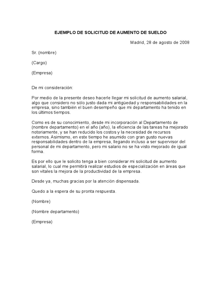 Este aumento puede ser otorgado por iniciativa de la empresa o a solicitud del trabajador. Y también por los resultados que el departamento que tengo a cargo ha venido demostrando en los últimos años. Modelo de carta para pedido de aumento salarial do empregado a ser dirigida para o patrão ou responsável pelo pagamneto dos salários.